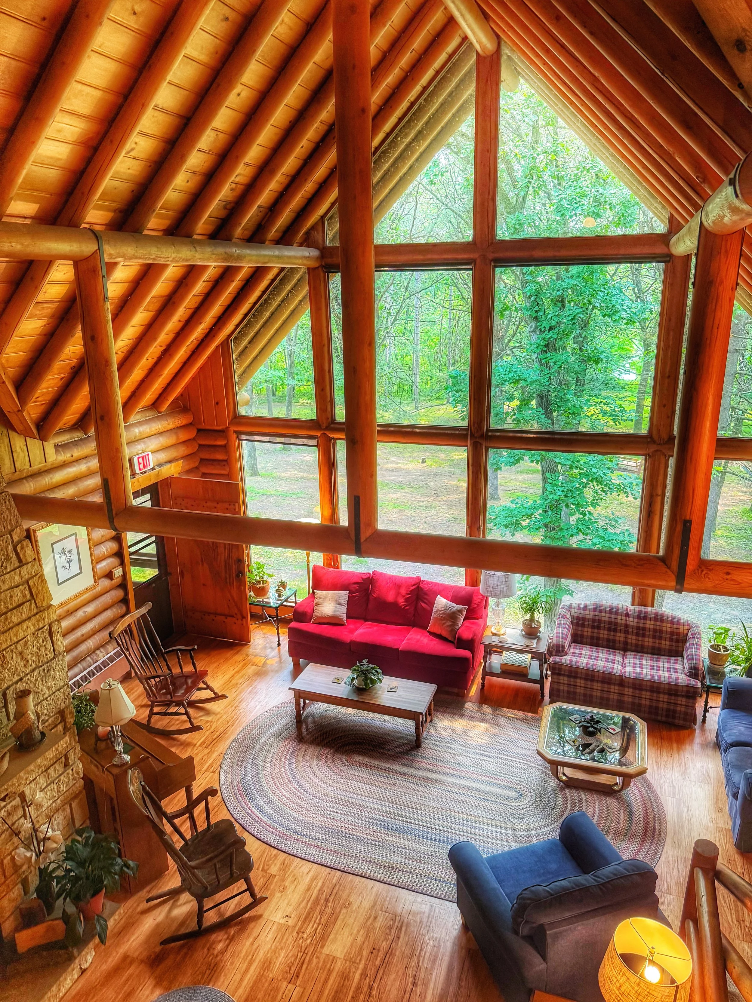 Single, high-ceiling room with tongue and groove pine walls